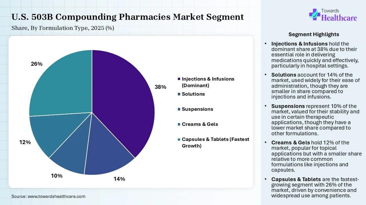 - By formulation type, the injections & infusions segment accounted for the highest revenue share of the U.S. 503B compounding pharmacies market by 38% in 2025.