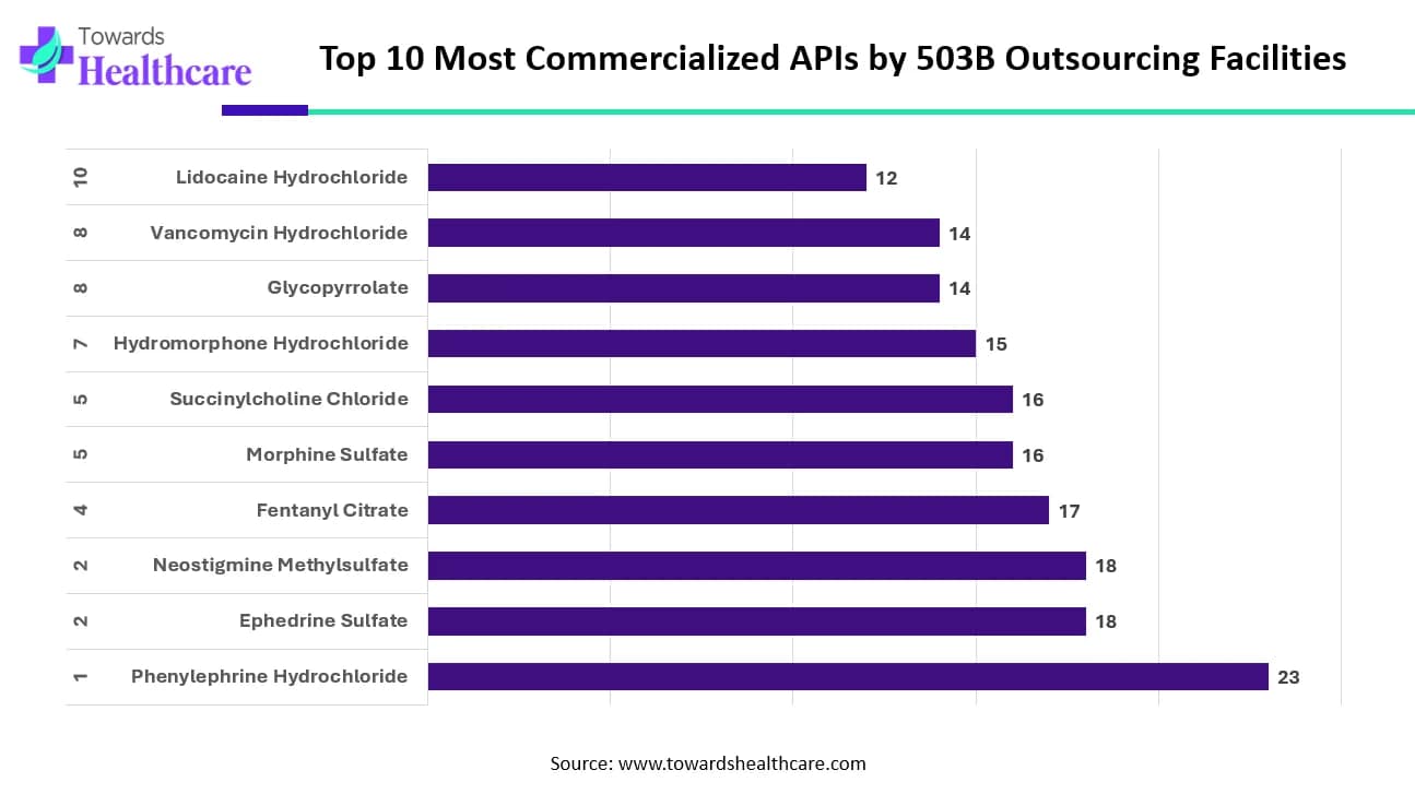 The data highlights which active pharmaceutical ingredients (APIs) are most commonly commercialized by 503B outsourcing facilities. Phenylephrine Hydrochloride leads the list, with the highest number of facilities producing products that contain it. This strong demand reflects its widespread use in emergency and critical care settings.