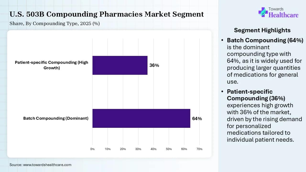 The batch compounding segment registered its dominance in the market by 64% share in 2025, owing to the permitted 503B outsourcing facilities to compound copies of FDA-approved drugs by addressing drug shortages. These facilities focus on utilizing automation while producing large batches to reduce per-unit costs for clinics and hospitals. They produce custom formulations with different dosage forms, specific strengths, or those free from preservatives or certain allergens.