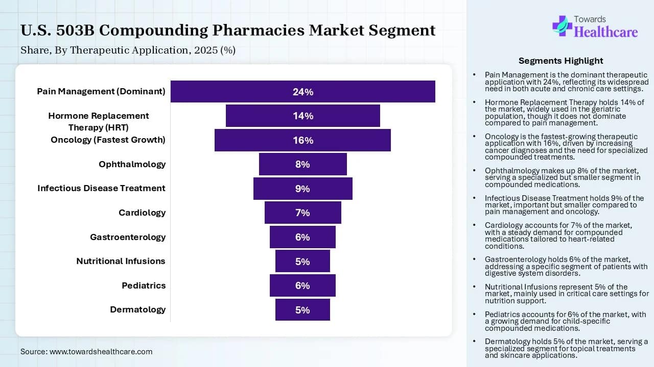 The pain management segment led the market by 24% share in 2025, owing to the large-scale supply of critical analgesics, increased focus on addressing drug shortages, and a shift towards ready-to-use formulations. The 503B facilities offer alternative dosage forms for patients who cannot swallow pills. They also create alternate delivery methods like liquid suspensions and transdermal gels.